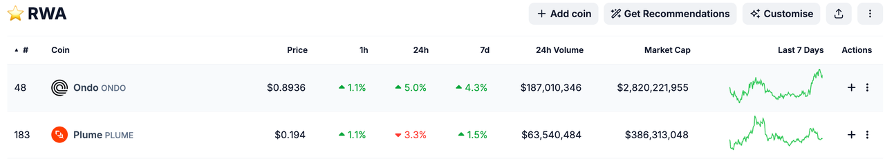 - RWA 赛道领导地位 Ondo 是 RWA 领域的头部项目,专注于 tokenization 的合规性和实用性。随着全球对现实资产上链的需求增长(如房地产、国债),Ondo 的先发优势和与传统金融的深度整合,使其有望在这一高潜力赛道中保持领先,吸引更多资金流入。