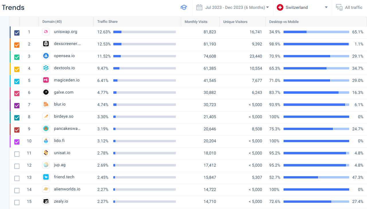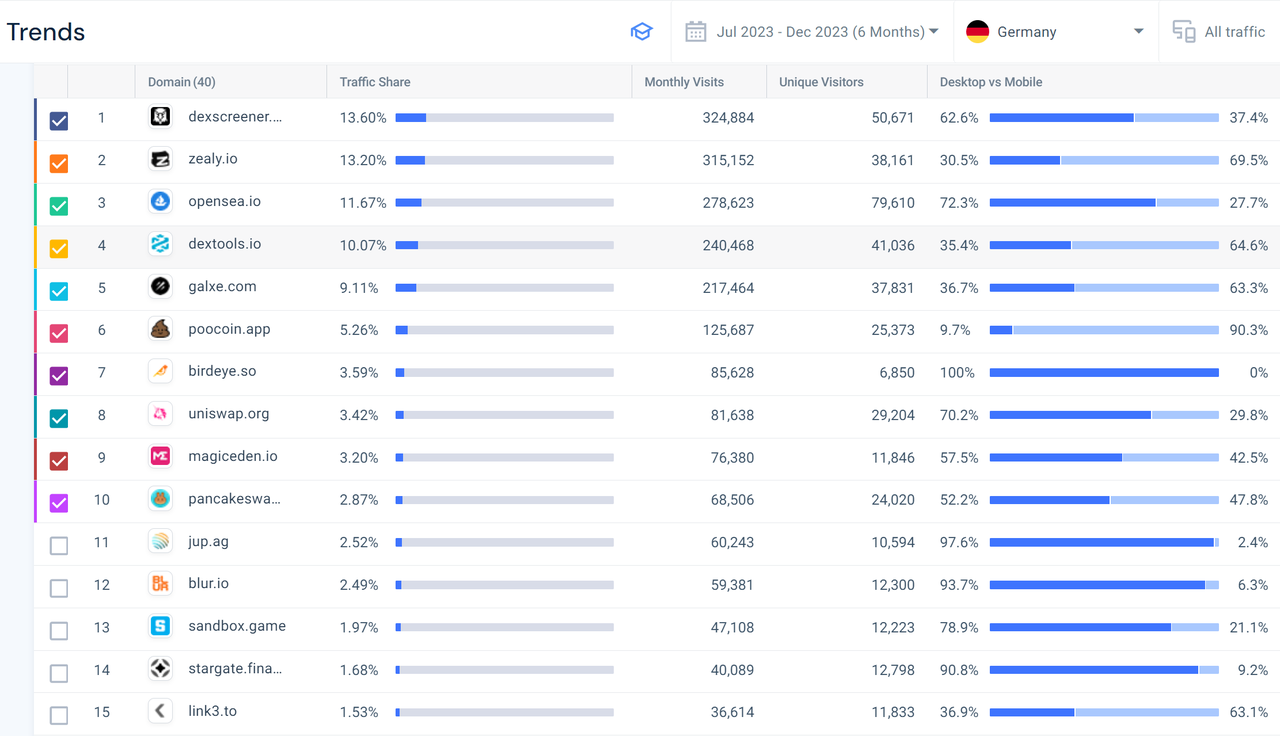 德国用户在西欧国家中使用去中心化交易所的占比较高,其中UniSwap、PancakeSwap、1inch等均是用户使用较多的去中心化交易所产品。从各公链来看,公链头部的DEX在德国的流量均表现较高,活跃公链包括 Ethereum、BSC、Solana、Avalanche、Cosmos等。随着23年10月至12月Solana生态复苏,Solana相关的去中心化交易所Raydium等均出现流量复苏。