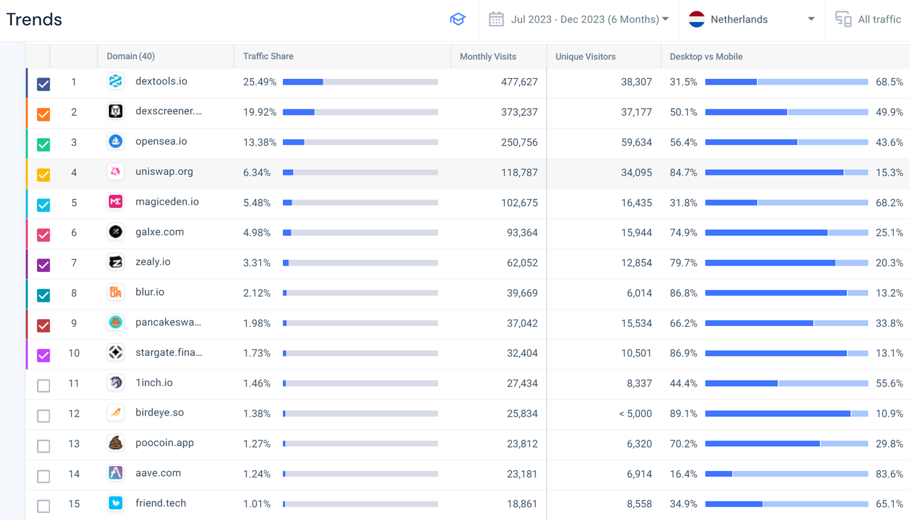 应用交互方面,荷兰用户在Defi赛道有一定参与度,其中Dydx参与度在全球前列;其次是Dextool、web3任务平台类项目;整体参与流量规模在全球中上水平,有较好DeFi、Dex山寨币接受度